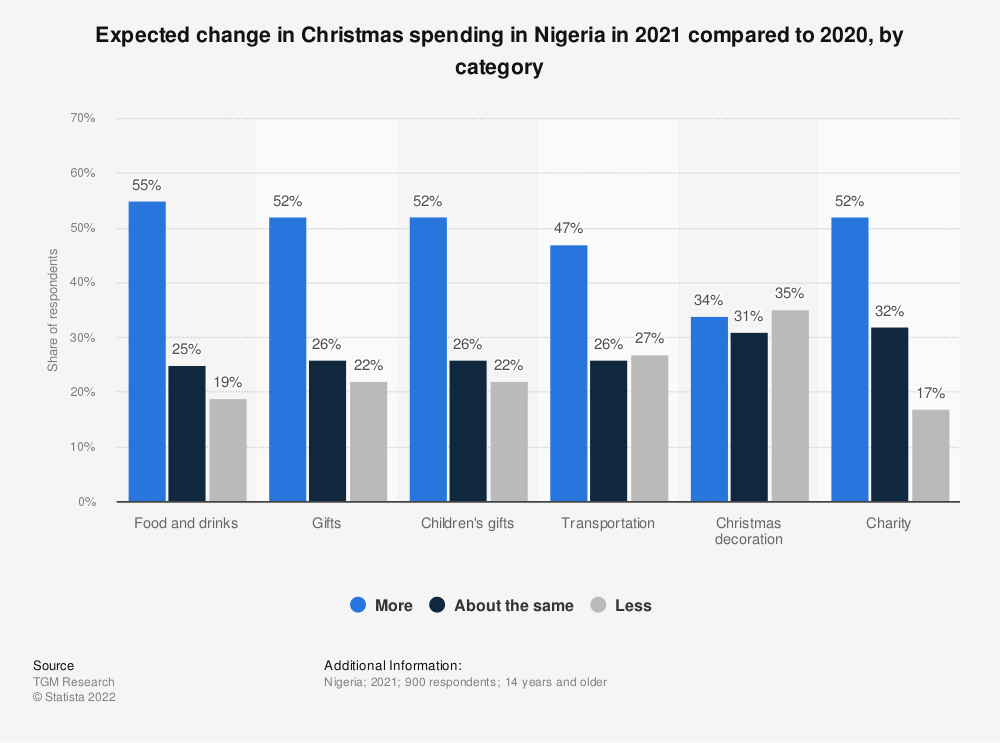 “In 2021, over half of the Nigerian participants in a Christmas survey said they would spend more money during the holidays on all aspects related to the occasion, including food and drinks, gifts, transport, and charity. Christmas decoration was the only exception, as 35 per cent claimed they would spend less, compared to 34 per cent who reported they would spend more”, Statista remarked.