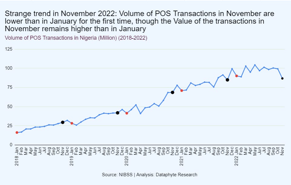 For the first time in 5 years, the volume of POS transactions in Nigeria in November fell below that in January.