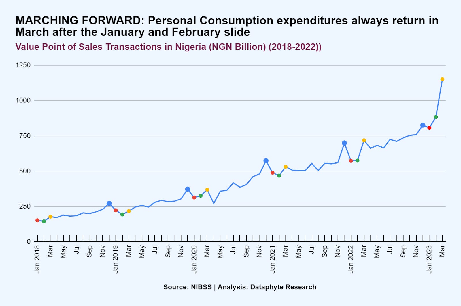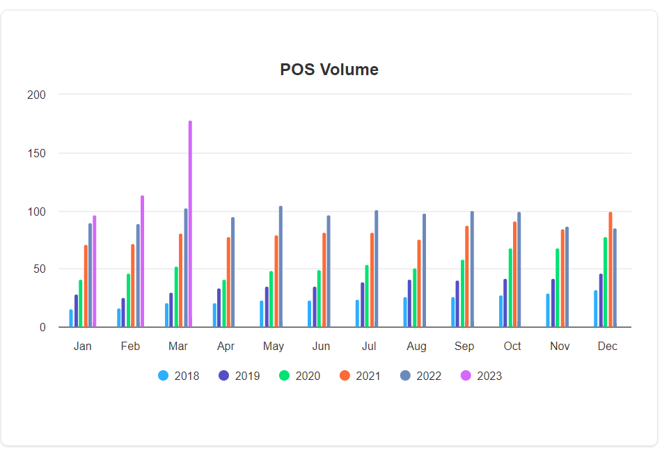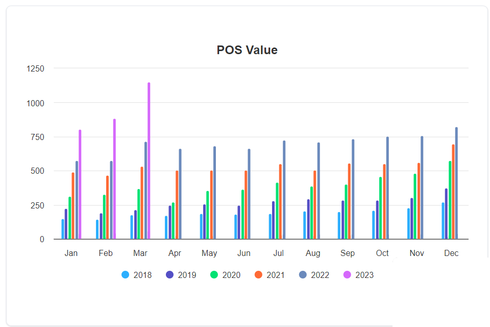 Consumer spending, proxied by the value of POS transactions, bounced back in an unprecedented way in March 2023.