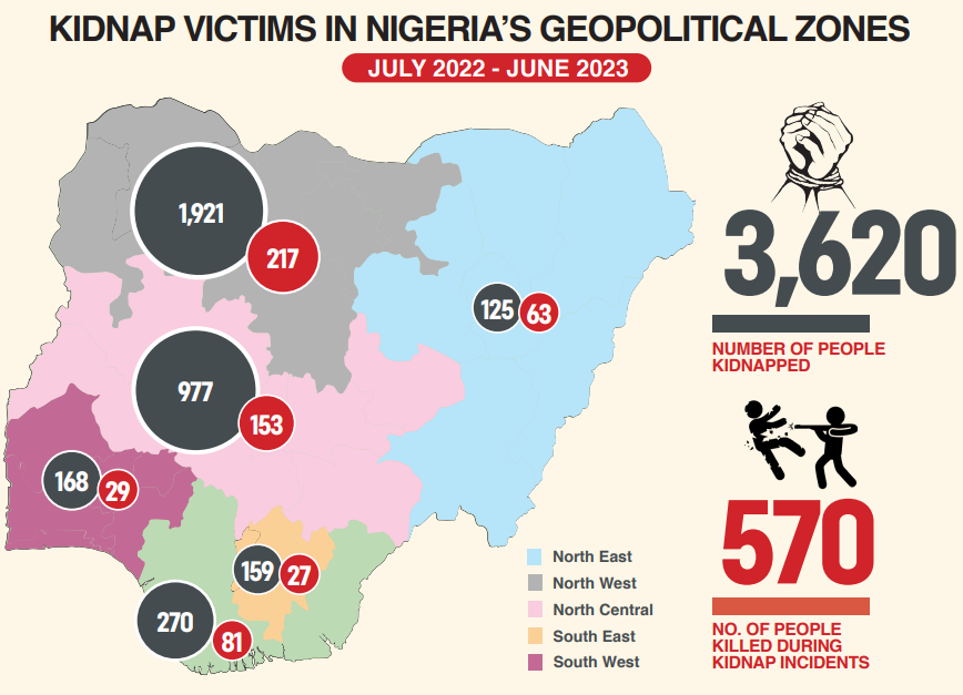 About 3,620 people were kidnapped in Nigeria between June 2022 and June 2023. The North Central, which consists of states like Abuja, Kogi, Nasarawa, and others, recorded the second-highest number of kidnapped people.