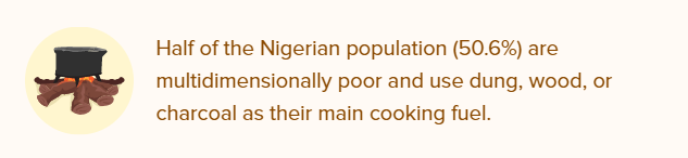 Also, half of the Nigerian population (50.6%) who are multidimensionally poor use dung, wood, or charcoal as their main cooking fuel.