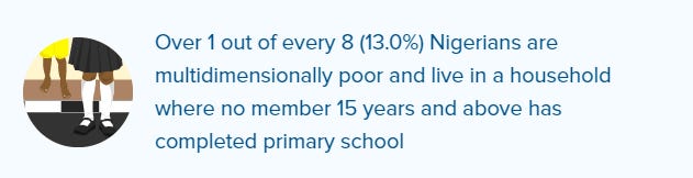 “More than 1 out of 5 Nigerians (15.9%) are multidimensionally poor and affected by underemployment in their households. A household is deprived if at least one household member aged 15 years and above is working fewer than 40 hours per week but is available and willing to do extra hours of work