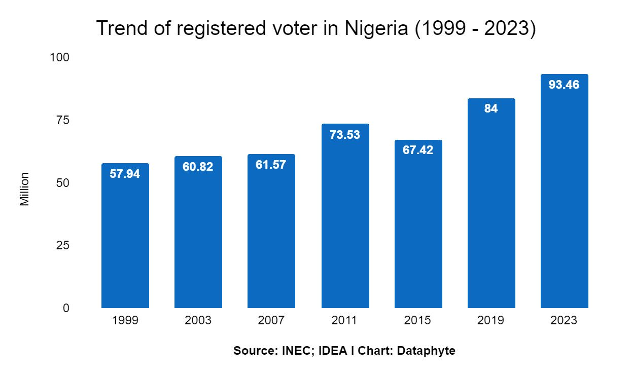 Dataphyte reported that, “Although an increase in registered voters has not necessarily translated into an increase in voter turnout in recent elections, INEC has said it is targeting at least 50% voter turnout in the 2023 general election.