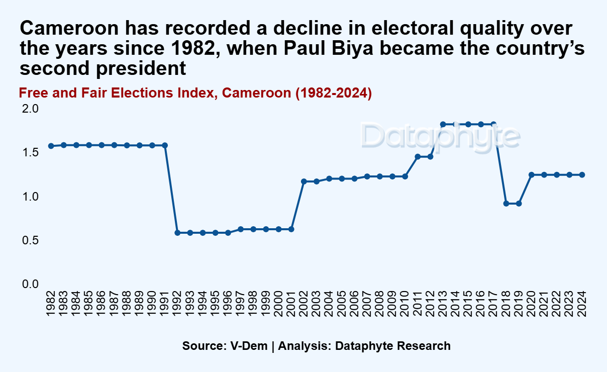 Since then, Cameroon has seen steady backsliding in democratic governance. Elections continue to take place, but observers and rights groups say they fall short of basic democratic standards. The process is often marked by limited political competition, restrictions on opposition activity, and the heavy use of state resources by the ruling party.