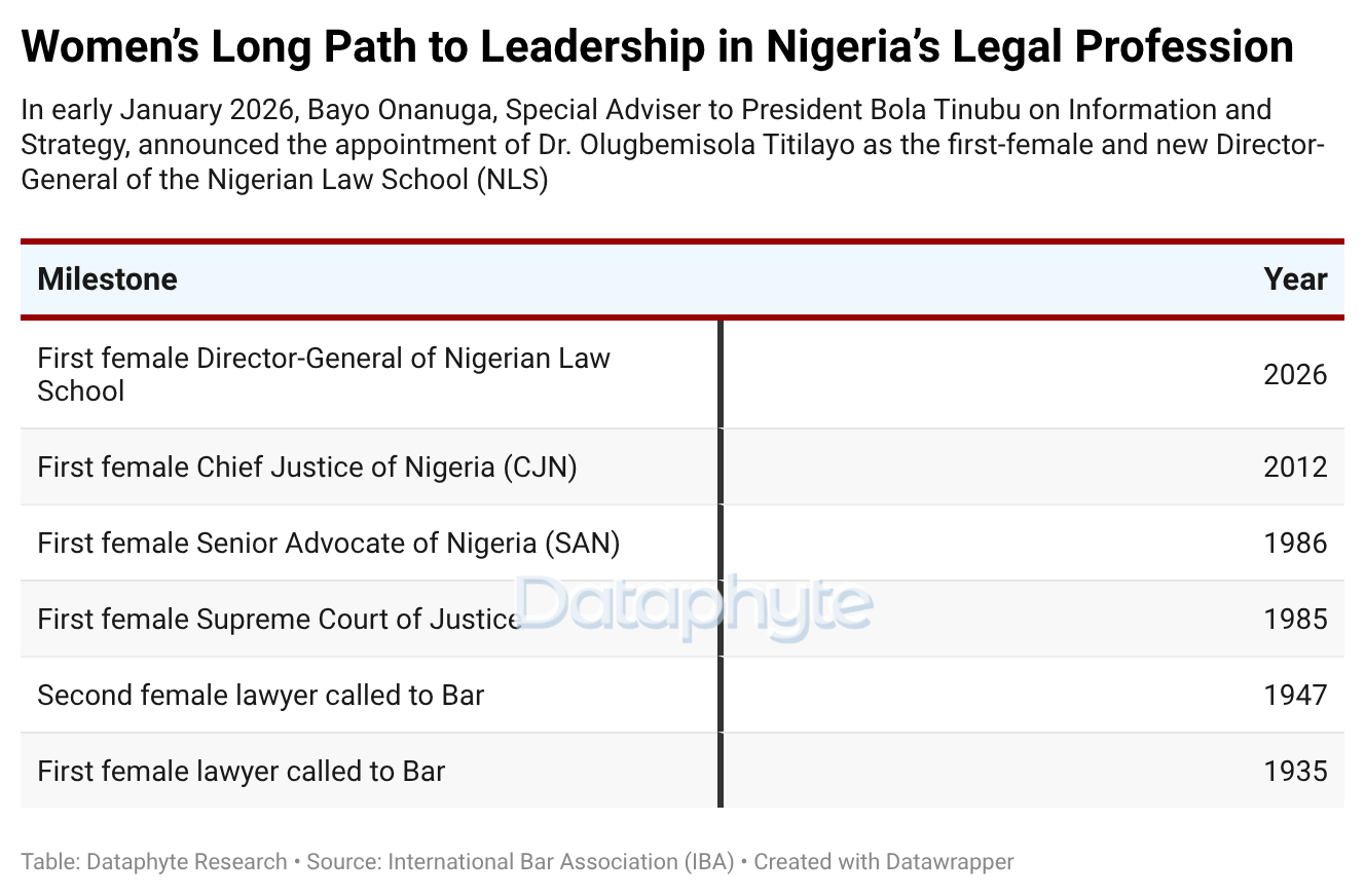 In early January 2026, Bayo Onanuga, Special Adviser to President Bola Tinubu on Information and Strategy, announced the appointment of Dr Olugbemisola Titilayo as the new Director General of the Nigerian Law School. Her appointment, which took effect on January 10, 2026, is for a four-year term and makes her the first woman to lead the institution since its establishment in 1962.