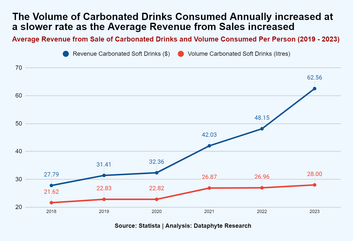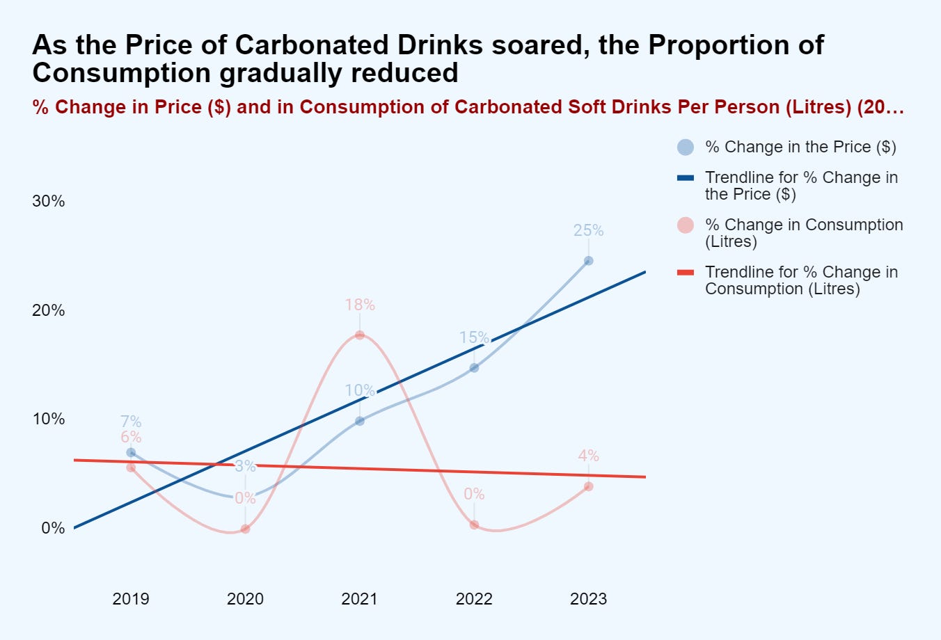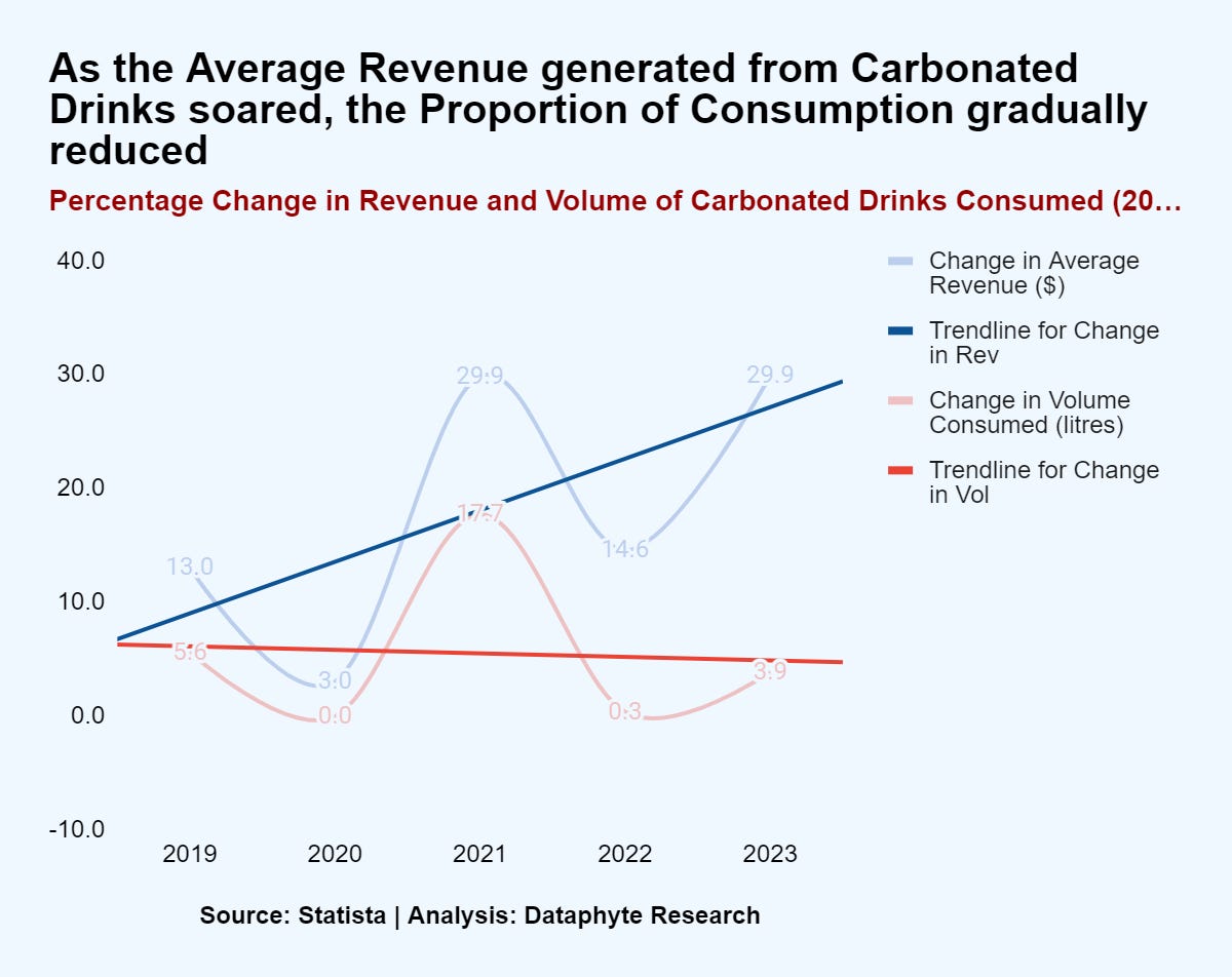 While the annual price of carbonated drinks rose from 7% in 2019 over 2018 to 25% in 2023 over 2022, the percentage increase in volume consumed decreased from 6% in 2019 over 2018 to 4% in 2023 over 2022.