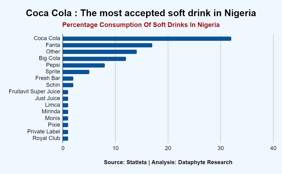 Coca-Cola is the most preferred brand for carbonated drinks in Nigeria. Analysis showed that about 32% of carbonated drinks consumed were Coca-Cola and 17% were Fanta.