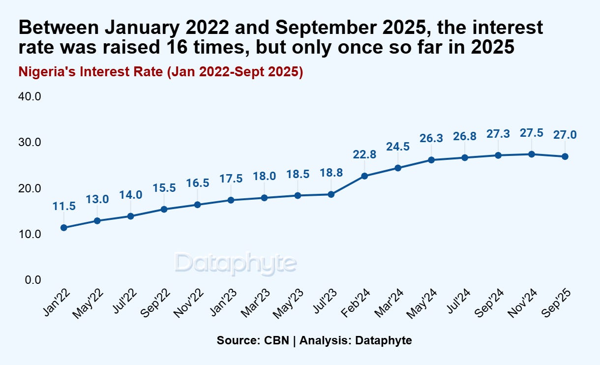Nigeria’s Monetary Policy Rate (MPR), the benchmark interest rate, was most recently adjusted to 27.00% in September 2025, following a 50 basis point reduction from 27.50%. The Central Bank of Nigeria (CBN) lowered the rate because of slowing inflation, aiming to make borrowing cheaper and encourage spending to boost the economy, while also aiming to maintain stability and prevent excessive price increases.