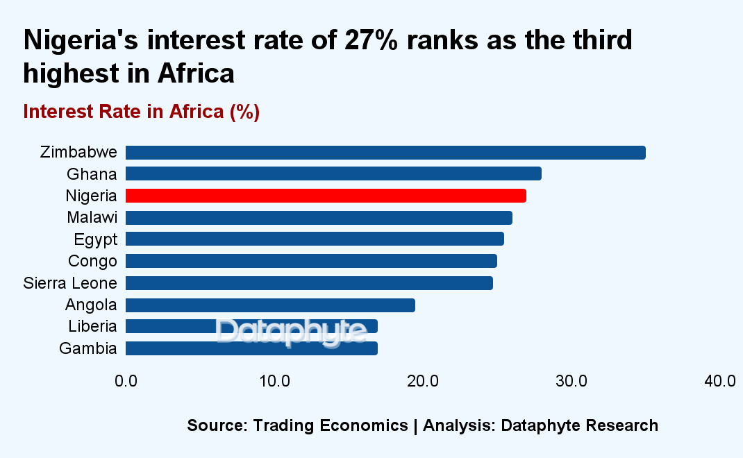 Even at 27%, Nigeria’s interest rate still remains the third highest in Africa, trailing only Zimbabwe (35%) and Ghana (28%). This places Nigeria ahead of other high-rate economies such as Malawi (26%), Egypt (25.5%), and Congo (25%), proving Nigeria’s position as one of the most expensive environments for borrowing in Africa.