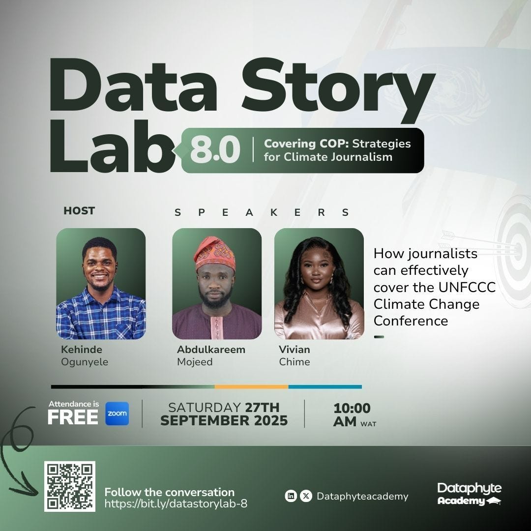 We are excited to invite you to the Dataphyte Academy “Data Story Lab 8.0” on Saturday, September 27th, at 10:00 AM WAT. This edition of the Lab is focused on equipping journalists with the tools and knowledge needed to effectively cover the UNFCCC Climate Change Conference. As one of the most significant global platforms for climate policy, the conference presents a unique opportunity for journalists to deepen their understanding of international negotiations, climate commitments, and the real-world implications for communities and ecosystems.